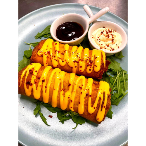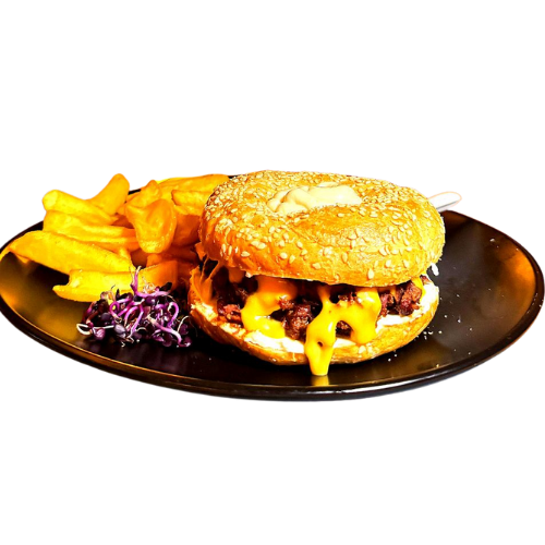 Bagel 80g, pulled pork 80g, branza cedar 20g,crema de branza 40g, sos usturoi 10g, cartofi prajiti* 150g, ketchup 10g