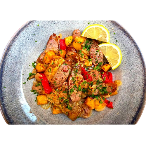 Pulpa superioara fara os 120g, carnati taranesti 60g, cartofi 70g, capia murati 40g, ceapa rosie 30g, sos cu unt 30g, suc lamaie 5g, usturoi 10g