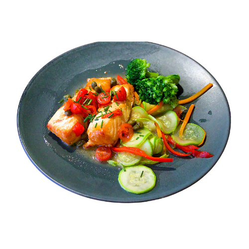 Somon afumat 120g, legume 150g, capere 5g,unt 15g, rosii cherry 20g