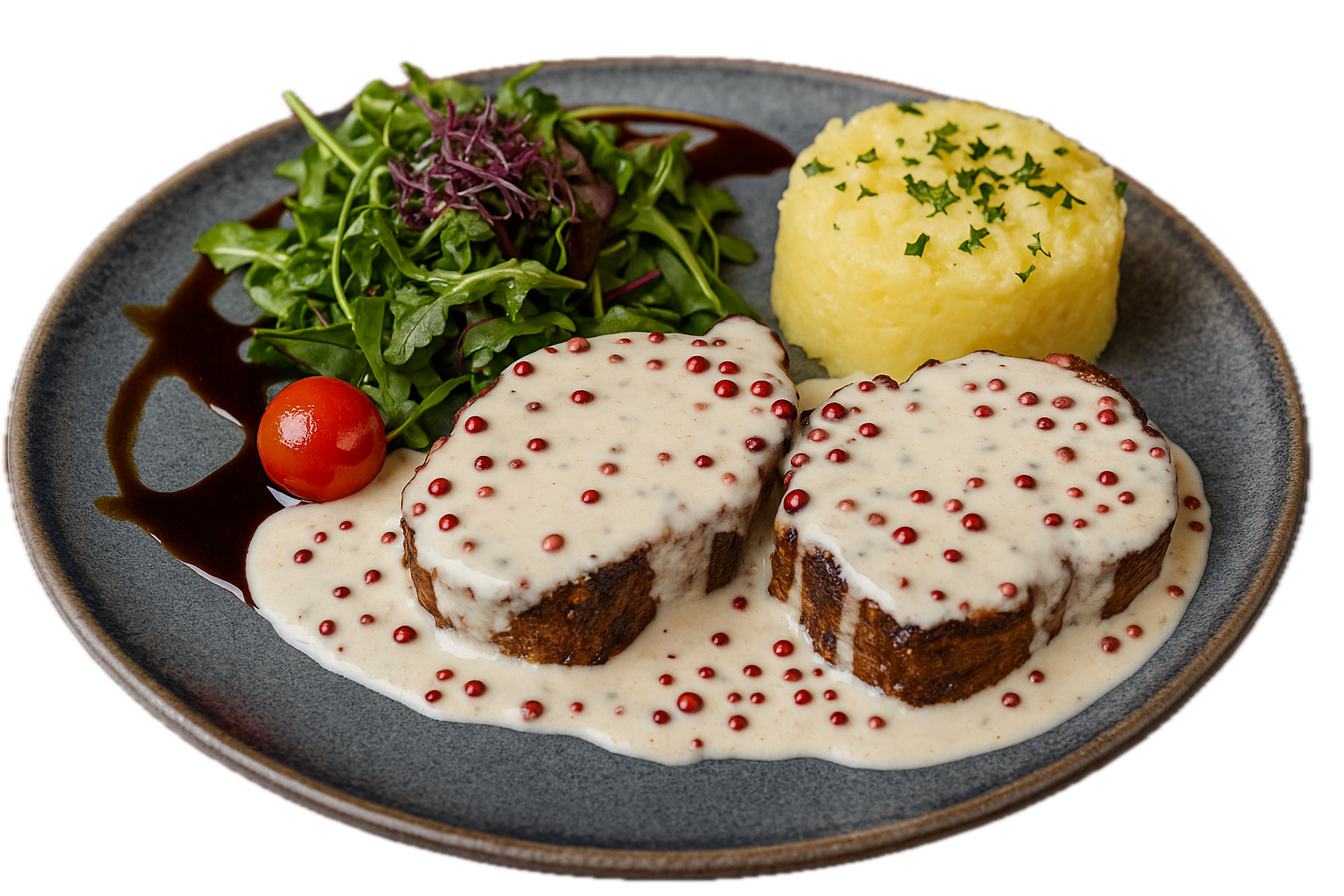Ceafa porc 150g, Gran Cuccina 30g, piper roz 5g, cartofi piuree 150g
